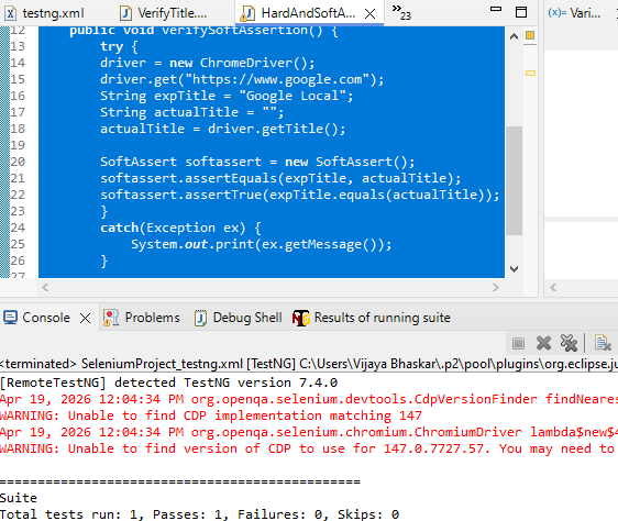 Assertions help to verify the expected data with application using Testng with Selenium. We have different kind of assertions are available for verification such as Hard assertions and Soft assertions. Hard assertions used to failed the test execution whenever the mismatch found with exception and soft assertions continue the test execution when assertions is failed. Below is the examples are provided for both Hard and soft assertions in selenium with Java and Testng.