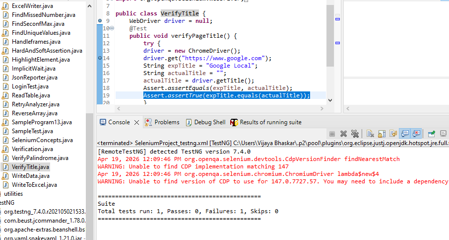 As we see in the image below test execution is failed due to mismatch with title ‘Yahoo’ and ‘Google’